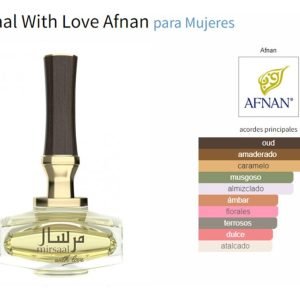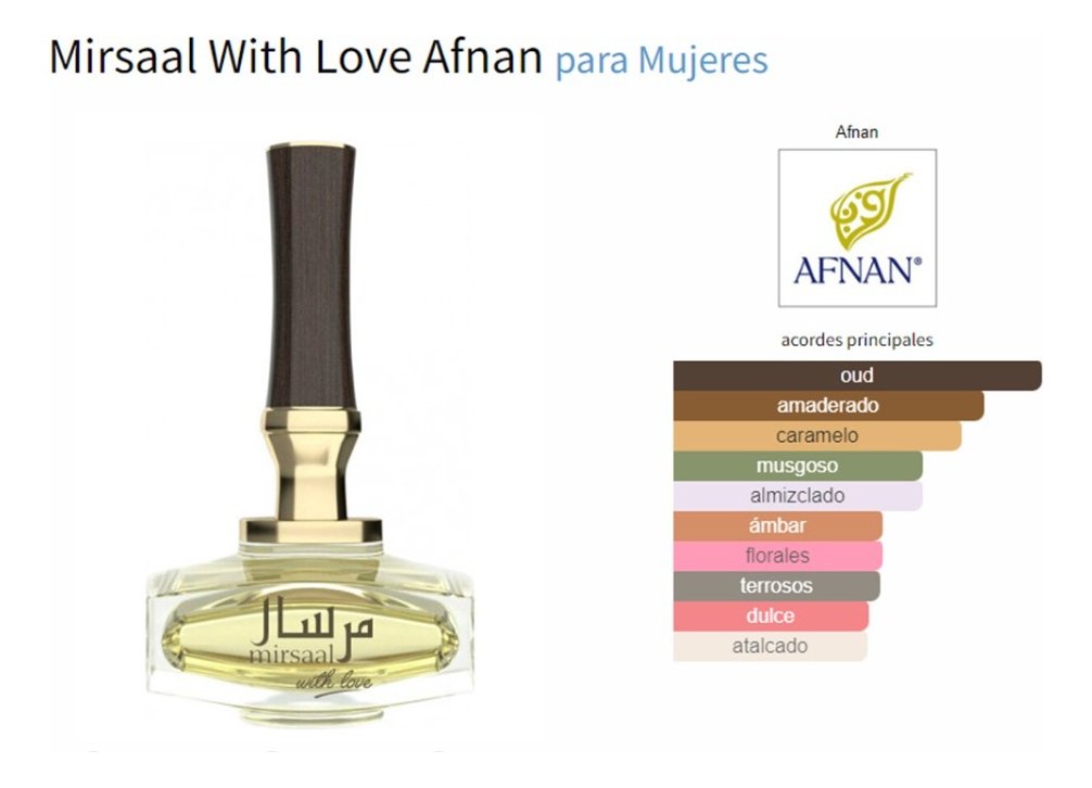 Características: Mirsaal With Love de Afnan es una fragancia de la familia olfativa Amaderada Aromática para Mujeres. Se lanzó en 2020. Las Notas de Salida son caramelo, notas herbales y notas verdes; las Notas de Corazón son madera de oud, notas amaderadas y notas florales; las Notas de Fondo son musgo, almizcle y ámbar.