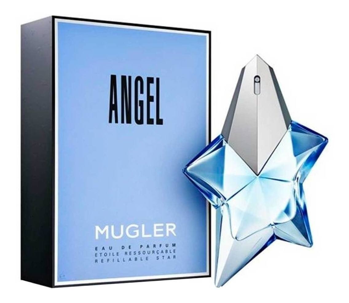 Angel de Mugler es una fragancia de la familia olfativa Oriental Vainilla para Mujeres. Angel se lanzó en 1992. Las Notas de Salida son melón, coco, mandarina, casia, jazmín, bergamota y algodón de azúcar; las Notas de Corazón son miel, chabacano , zarzamora (frambuesa negra), ciruela, orquídea, durazno (melocotón), jazmín, lirio de los valles (muguete), bayas rojas y rosa; las Notas de Fondo son haba tonka, ámbar, pachulí, almizcle, vainilla, chocolate oscuro y caramelo.
