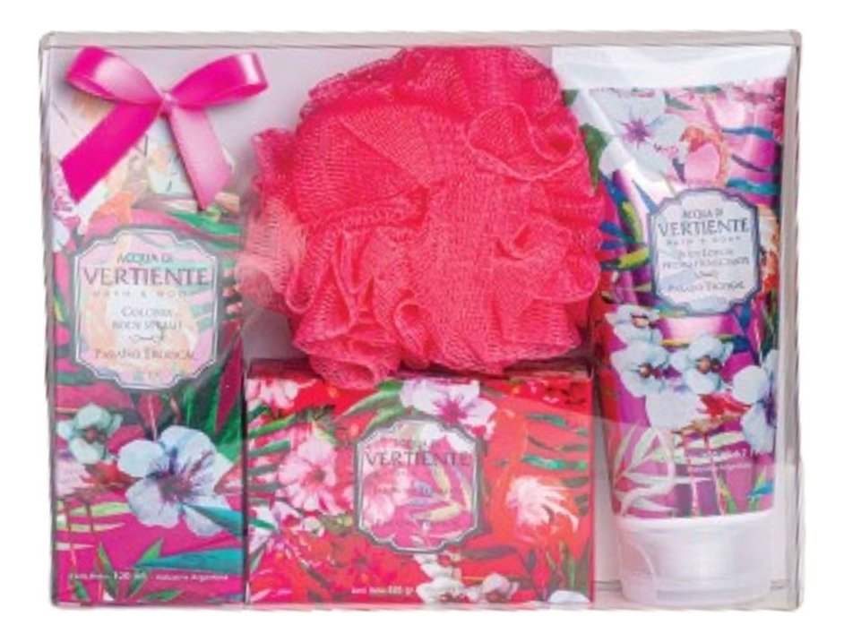 Este conjunto de productos de cuidado personal te transportará a un paraíso tropical. El estuche incluye una loción corporal de 200 ml, un body splash de 120 ml, un jabón de tocador y una esponja. La loción corporal y el body splash tienen un aroma tropical que te hará sentir como si estuvieras en una isla paradisíaca. El jabón de tocador limpia suavemente tu piel, mientras que la esponja te ayuda a aplicar los productos de manera efectiva. Este conjunto es ideal para mimarte o para regalar a alguien especial.